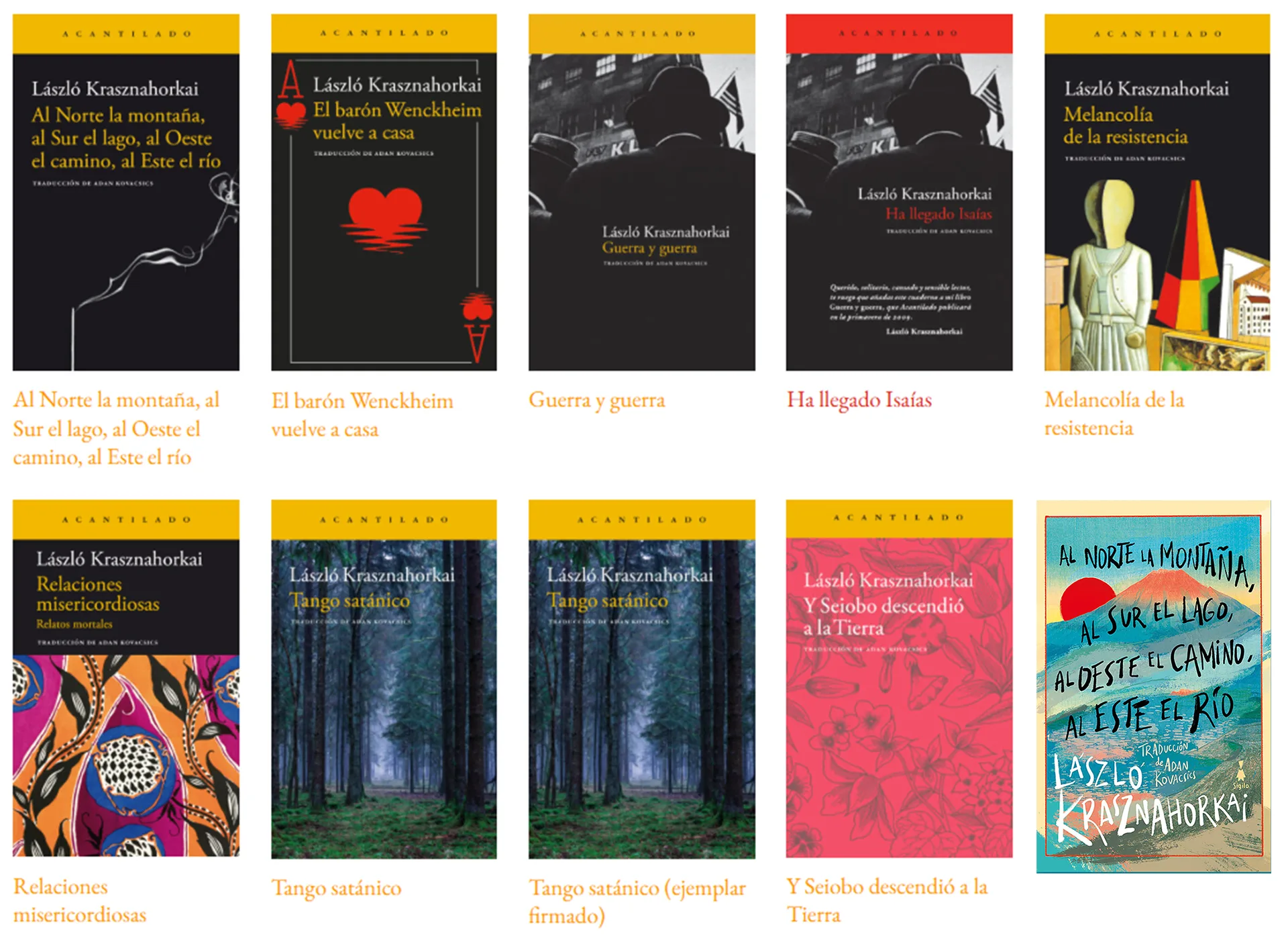 Entre las obras de László Krasznahorkai publicadas en castellano se encuentran las novelas Melancolía de la resistencia (Acantilado, 2001), Guerra y guerra (Acantilado, 2009), Tango satánico (Acantilado, 2017), Al Norte la montaña, al Sur el lago, al Oeste el camino, al Este el río (Acantilado, 2007, y Sigilo, 2025), Y Seiobo descendió a la Tierra (Acantilado, 2015) y El barón Wenckheim vuelve a casa (Acantilado, 2024), todas traducidas a nuestro idioma por Adan Kovacsics.